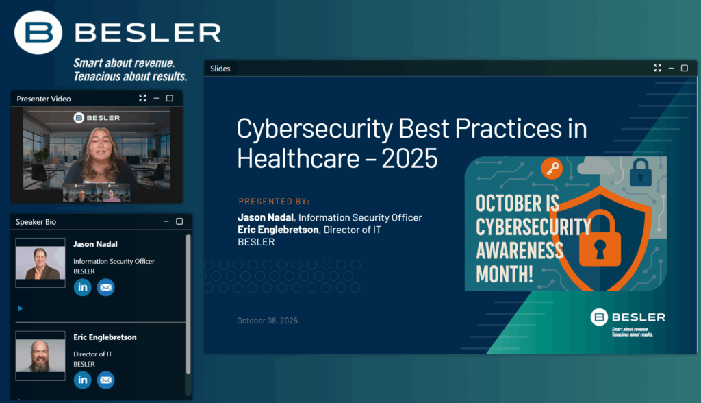 Celebrate National Cybersecurity Awareness Month with us by joining our upcoming webinar: Cybersecurity Best Practices & Strategies. Delve into the world of healthcare cybersecurity with BESLER’s esteemed Information Security Officer, Jason Nadal and BESLER’s Director of Information Technology Eric Englebretson. Gain valuable everyday tips that can be applied both at work and at home.