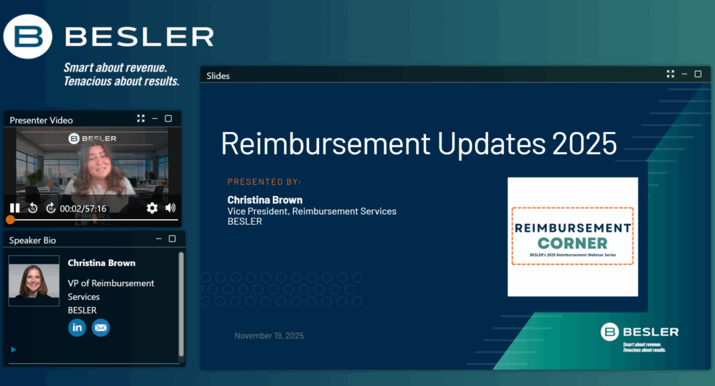 Be part of the next session in BESLER’s Reimbursement Corner Series: Reimbursement Updates 2025. Join Christina Brown, BESLER’s VP of Reimbursement, as she explores the latest developments in IPPS and OPPS rulings, provides an overview of critical transmittal updates, and examines important changes to the SNF 2540-24. The session will also offer a recap of key takeaways from recent webinars, ensuring you’re up to date on the most impactful reimbursement trends and regulations.